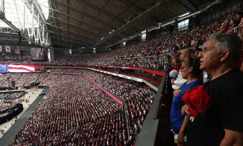 Large crowds come together in the commemorative service of Charlie Kirk at the Glendale, Arizona state Farm Stadium on September 21, 2025. (Charly Triballeau / AFP / Getty Images)