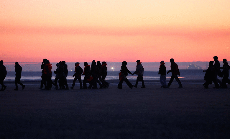 Migrants walk along the beach before attempting to board a rubber dinghy leaving the coast of northern France to attempt to cross the English Channel to Britain, from Petit-Fort-Philippe beach in Gravelines, near Calais, France, August 25, 2025. (Reuters)