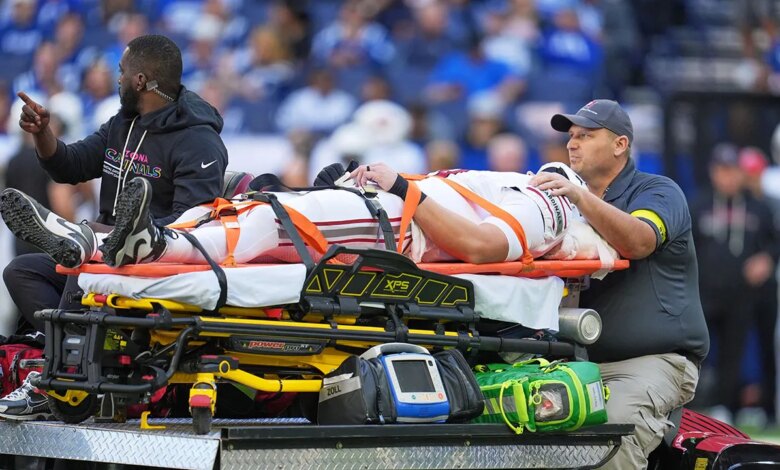 Travis Vokolek of the Arizona Cardinals is injured during the first half of an NFL football game against the Indianapolis Colts Sunday, Oct. 12, 2025, in Indianapolis. (AP Photo/Michael Conroy)