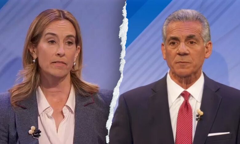 Republican Jack Ciattarelli, left, watches as Democrat Mikie Sherrill speaks during the final debate in the New Jersey governor’s race, Wednesday, Oct. 8, 2025, in New Brunswick, New Jersey. (AP/Heather Khalifa)