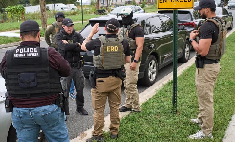 Federal agents, including several with Enforcement and Removal Operations (ERO), part of U.S. Immigration and Customs Enforcement (ICE), regroup before embarking on an operation Monday, September 29, 2025, in northwest Washington, DC. (Jacquelyn Martin/AP)