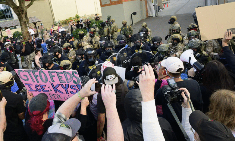 Law enforcement officials and protesters gathered outside a U.S. Immigration and Customs Enforcement office in Portland, Oregon, September 28, 2025. (Getty Images)