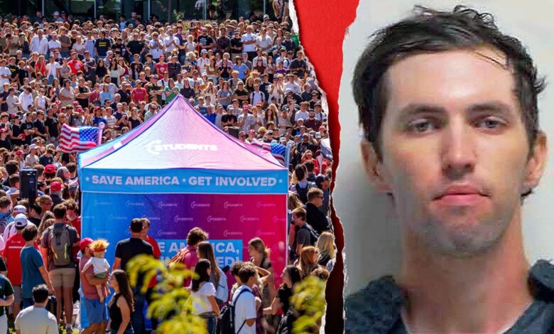 A crowd looks at Charlie Kirk to appear at Utah Valley University on September 10, 2025 in Orem, Utah, on the left, next to a booking photo for Tyler Robinson, 22, the suspect in the assassination of Kirk. (Trent Nelson / The Salt Lake Tribune / Getty Images and Washington Co. Sheriff’s Office)