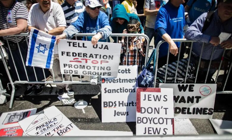 File – On this Sunday, June 1, 2014, a file photo, demonstrators against the boycott, divestment and sanctions (BDS) movement are held behind a police barricade during the Celebrate Israel parade in New York. The international boycott movement against Israel about its treatment of Palestinians has enlisted in the United States once a unifying cause of generations of American Jews, Israel now bitterly divides Jewish communities. (AP photo / John Minchillo) (The Associated Press)