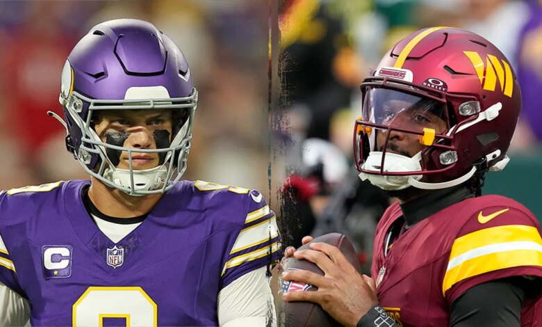 The Vikings of Minnesota JJ McCarthy (9) Vikings reacts after a game during the first half against the Falcons of Atlanta at US Bank Stadium in Minneapolis, Minnesota, on September 14, 2025 while the quarter of the commanders of Washington Jayden Daniels (5) warms up before a match against the 425 packers. (Imagn)