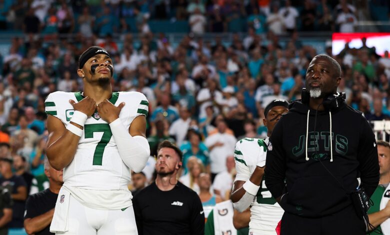 Justin Fields and Aaron Glenn of the New York Jets stand on the sideline during the national anthem before a game against the Miami Dolphins at Hard Rock Stadium on September 29, 2025, in Miami Gardens, Florida. (Logan Bowles/Getty Images)