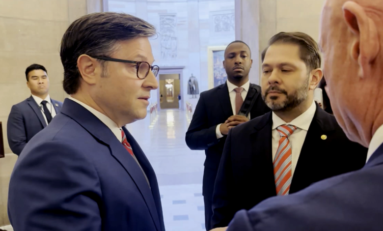 House Speaker Mike Johnson speaks with Senators Ruben Gallego and Mark Kelly