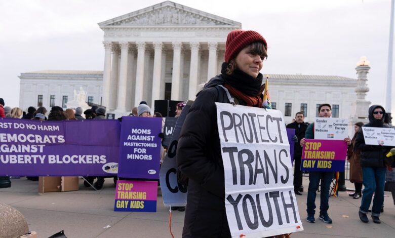 The demonstrators for and against the care asserted by the sexes for transgender minors demonstrated outside the Supreme Court on December 4, 2024, in Washington. (Jose Luis Magana / Associated Press) file