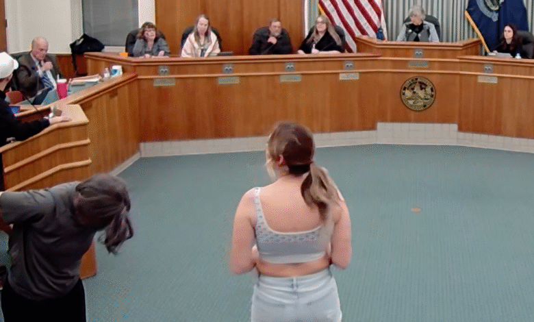 Two women strip naked during a school board meeting in Augusta, Maine, to protest trans athletes in women’s sports. (Augusta Schools)