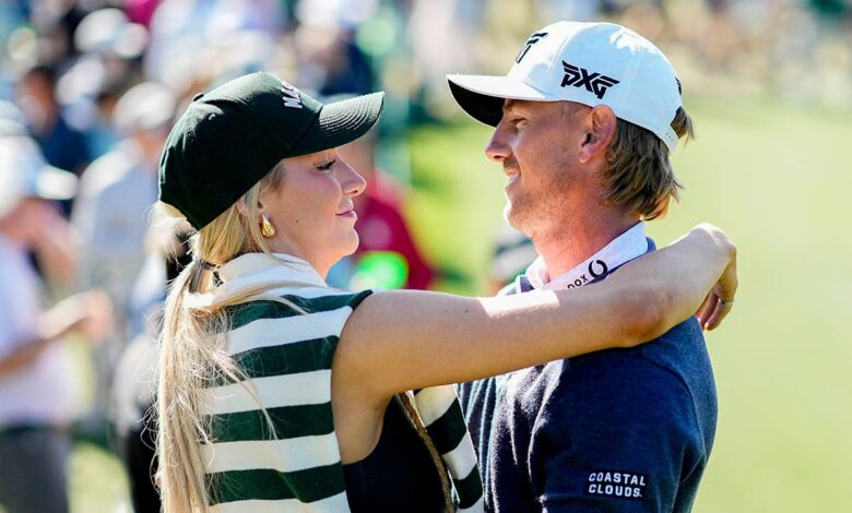 Jake Knapp embraces his girlfriend, Makena White, while leaving the 18th green in the first round of the Cognizant Classic in Palm Beaches of the PGA National Resort The Champion Race on February 27, 2025, in Palm Beach Gardens, in Florida. (Ben Jared / Pga Tour via Getty Images)