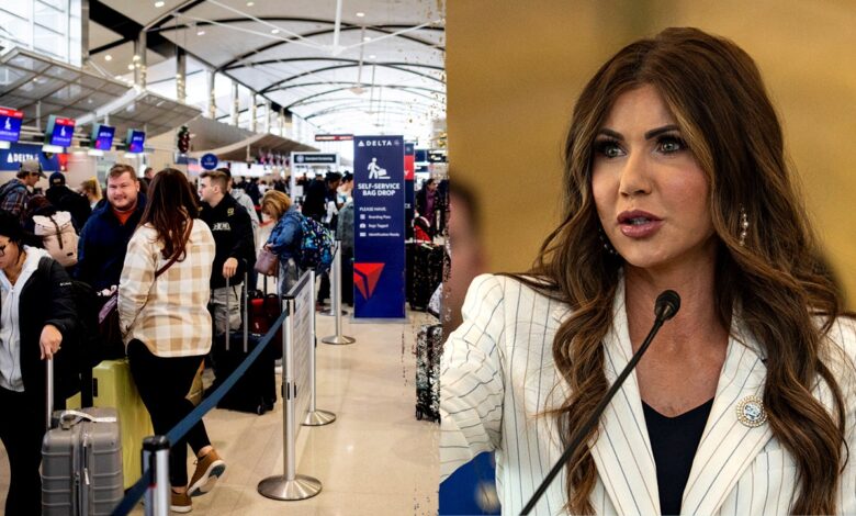Secretary Kristi Noem, who oversees the TSA, blasted Democrats for shutting down the government. (Kent Nishimura/Getty Images)