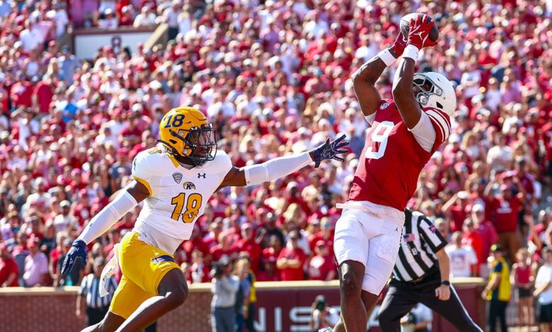 Oklahoma Sooners’ wide receiver, Keontez Lewis (9), caught up outside the limits in front of Kent State Golden Flashes defensive, back of the back-miler (18) and is injured in the first quarter of the Gaylord Family-Oklahoma stadium on October 4, 2025. (Images Kevin Jairaj / Imagn)