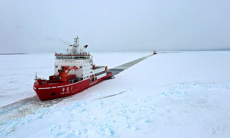 A drone photo taken on November 29, 2024 shows China’s research icebreakers Xuelong and Xuelong 2, or Snow Dragon and Snow Dragon 2, breaking ice near Zhongshan Station, a Chinese research base in Antarctica. The ships are part of China’s 41st Antarctic Expedition and will begin unloading operations after reaching their designated anchorage position. (Chen Dongbin/Xinhua via Getty Images)