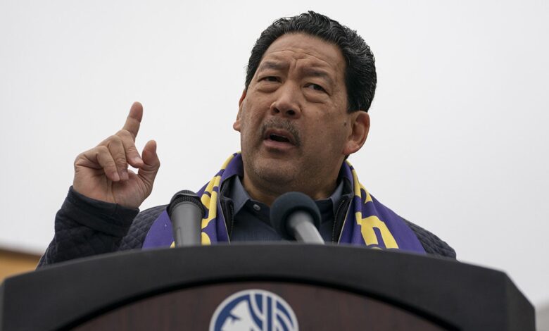 The mayor of Seattle, Bruce Harrell, speaks on a podium (David Ryder / Bloomberg via Getty Images)