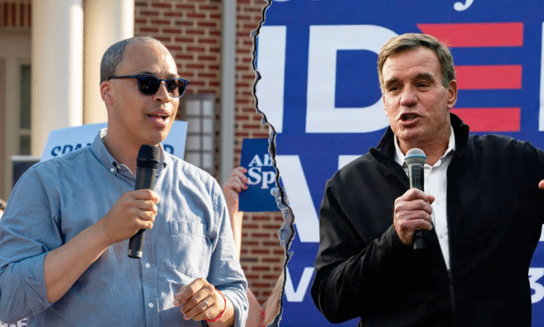 Start Sen. Mark Warner did not call on Virginia AG candidate Jay Jones to withdraw from the race. (Maxine Wallace/The Washington Post/Getty Images; AP Photo/Steve Helber)