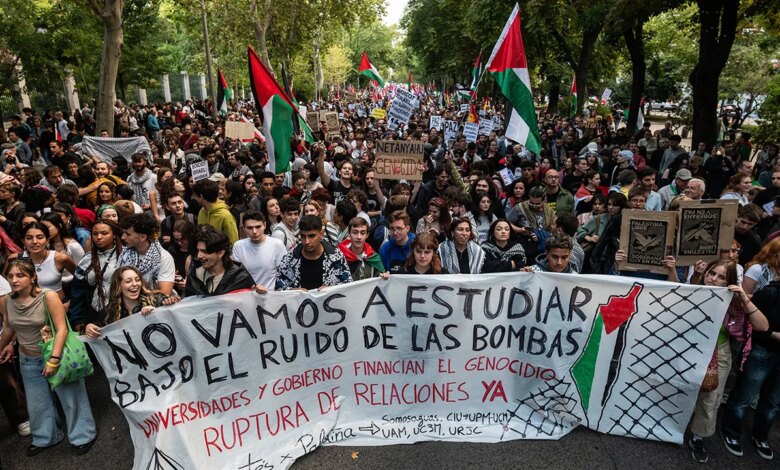 The Spaniards protest against Israel. The unions have called for a general strike day in solidarity with the Palestinians and Lebanon demanding that the Spanish government break relations with Israel. September 2024. (Marcos del Mazo / Lightrocket via Getty Images)