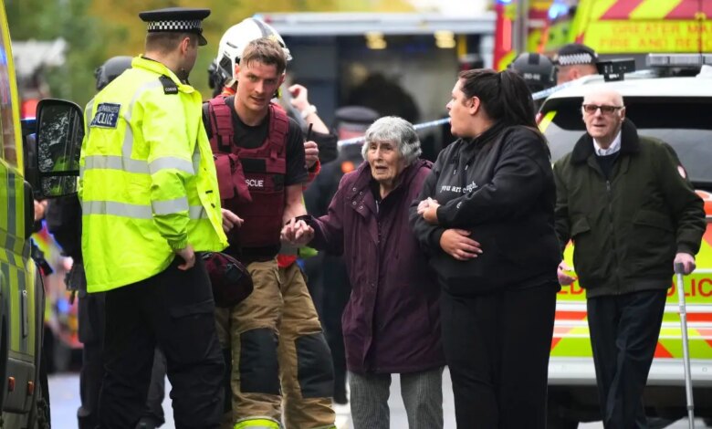 Emergency services escort people to security after a terrorist car and knife attack outside the Heaton Park Congregation of the Hebrew Congregation in Manchester, England on Thursday, October 2, 2025. The police said that two people had been killed, and four other injured before armed police shoot. (Christopher Furlong / Getty Images)