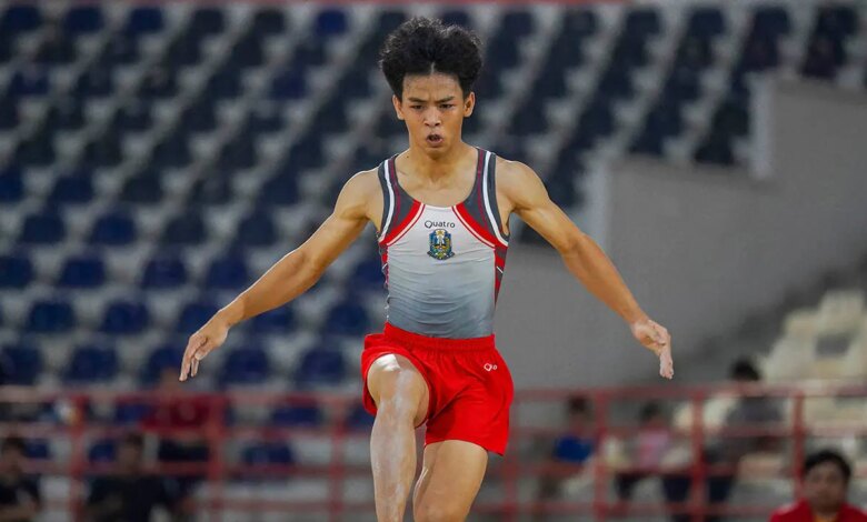 This photo taken on August 30, 2024 shows the Indonesian gymnast Naufal Takdir al Bari representing the east of Java in competition at the 21st national sports week in Deli Serdang, North Sumatra. (Hendra Syamhari / AFP via Getty Images)