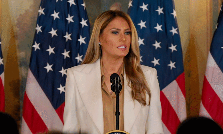 First Lady Melania Trump speaking on a podium
