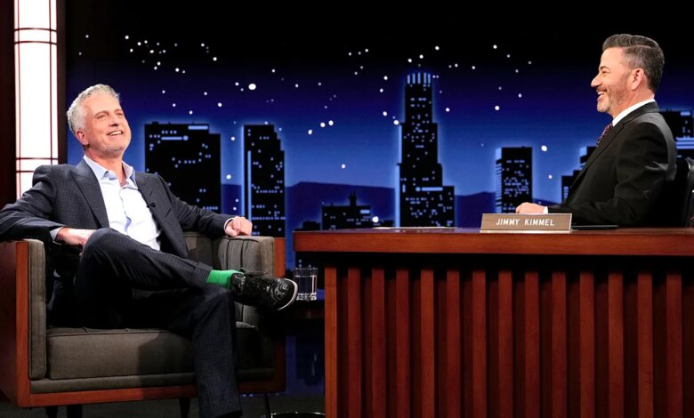 Bill Simmons appears as a guest in Jimmy Kimmel’s show. (Randy Holmes / Disney via Getty Images)