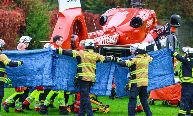 The emergency services responsible for the newly elected mayor of Hardecke, Iris Stalzer in a helicopter before being for life in the neighboring hospital on October 7, 2025 in Herdecke, Germany. (Alex Talash / Picture Alliance via Getty Images)