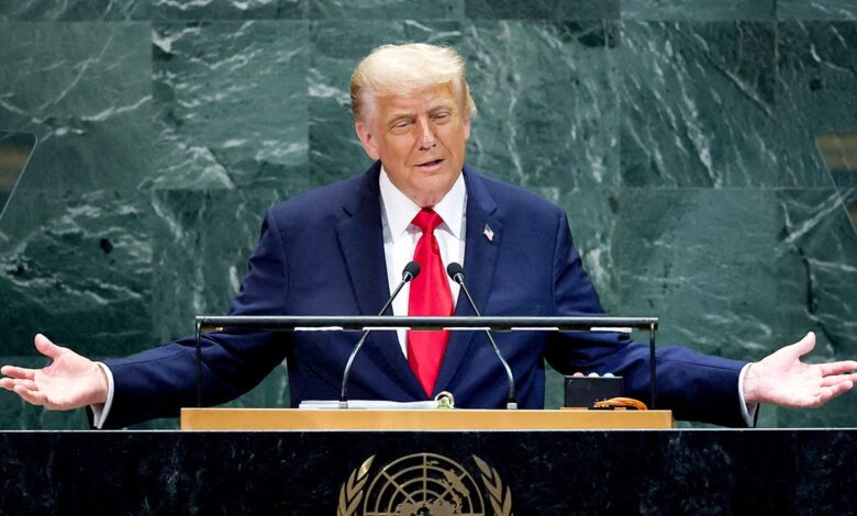 President Donald Trump at the United Nations General Assembly in New York on Tuesday, September 23, 2025. (David Dee Delgado / Bloomberg via Getty Images)