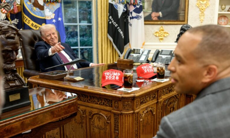 A “Trump 2028” hat is seen in the foreground in the oval office, as president of the Mike Johnson room, R-La., Left, the head of the Senate minority, Chuck Schumer, Dn.y., and the minority head of the Hakeem Jeffries, Dn.y. Chamber, met President Donald Trump to discuss the way to avoid a possible government. (@Realdonaldtrump via social social)