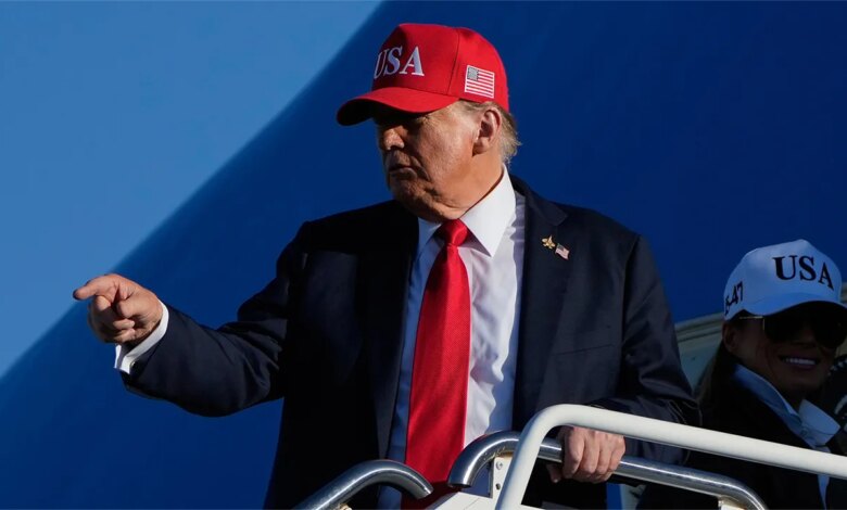President Donald Trump is making gestures as he gets on the Air Force One with First Lady Melania Trump at the Naval Station of Norfolk Chambers Field in Norfolk, Virginia, Sunday, October 5, 2025. (Alex Brandon / AP Photo)
