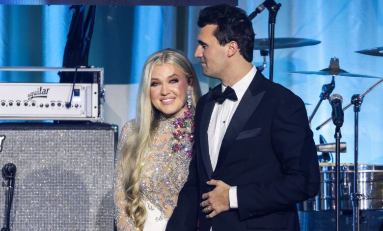 Conservative activist Charlie Kirk is represented with his wife Erika Kirk on stage during an event earlier this year in Phoenix. Erika Kirk has since entered the spotlight after her death. (Samuel Corum / Getty Images)
