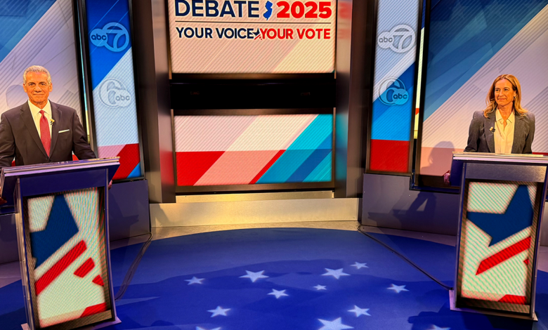 New Jersey Democratic gubernatorial candidate Rep. Mikie Sherrill, right, and Republican candidate Jack Ciattarelli, on stage at the start of their second and final debate October 8, 2025 in New Brunswick, New Jersey. (Paul Steinhauser – Fox News Digital)