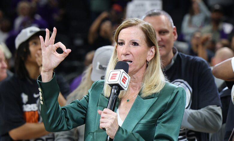 WNBA Commissioner Cathy Engelbert speaks to the crowd after the Las Vegas Aces won Game 4 of the 2025 WNBA Finals at the Mortgage Matchup Center on October 10, 2025 in Phoenix, Arizona. The Las Vegas Aces defeated the Phoenix Mercury 97-86 to win the championship. (Christian Petersen/Getty Images)