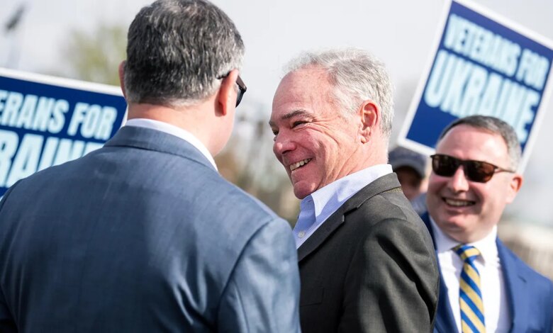 Senator Tim Kaine, D-VA., Center, speaks with the representative Eugene Vindman, on the left, and his brother Alexander Vindman in Washington in 2024. (Tom Williams / CQ-Roll Call, included via Getty Images)